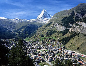 Ein Blick über das Dorf Zermatt, wie es sich im Sommer präsentiert. Im Hintergrund das Matterhorn. |