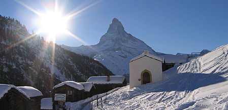 Hier der kleine Weiler Findeln im Winter mit wunderschönem Blick aufs Matterhorn. |