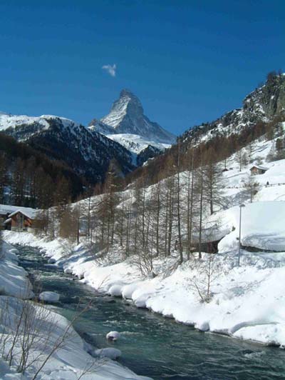 Ein kleiner Bach in der schönen Winterlandschaft etwas unterhalb von Zermatt. |